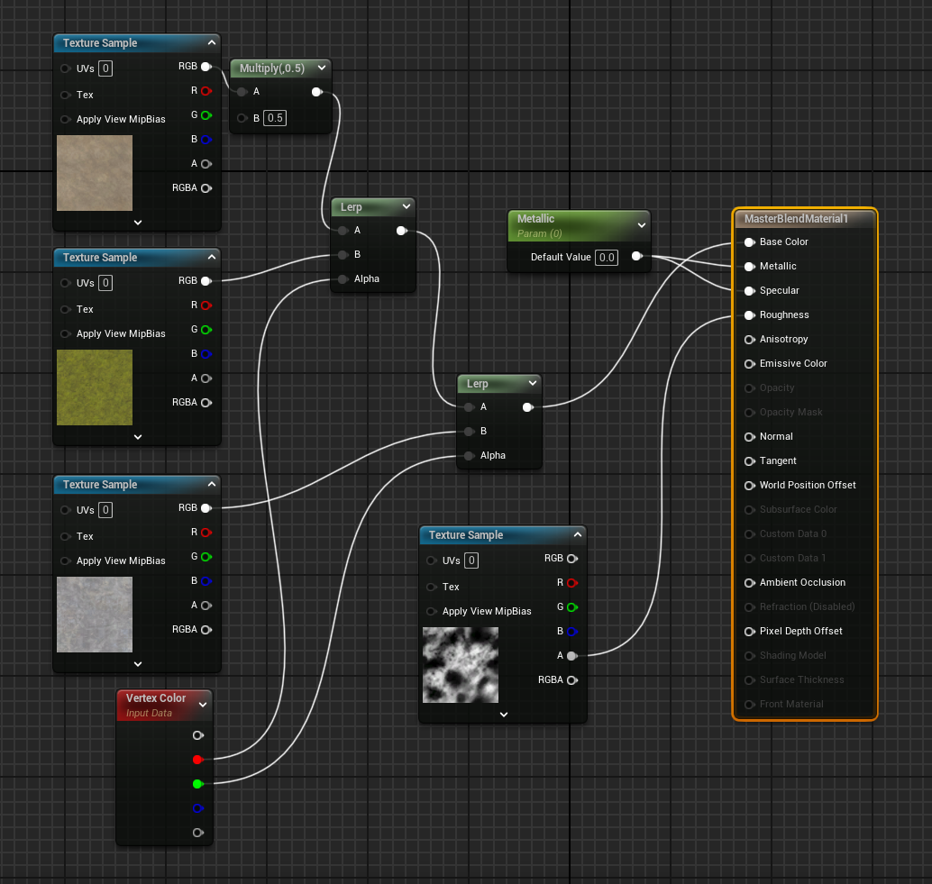 With the current setup, the number of textures it can lerp is limited by the colour channels in the Vertex Colour but is otherwise simple to change.